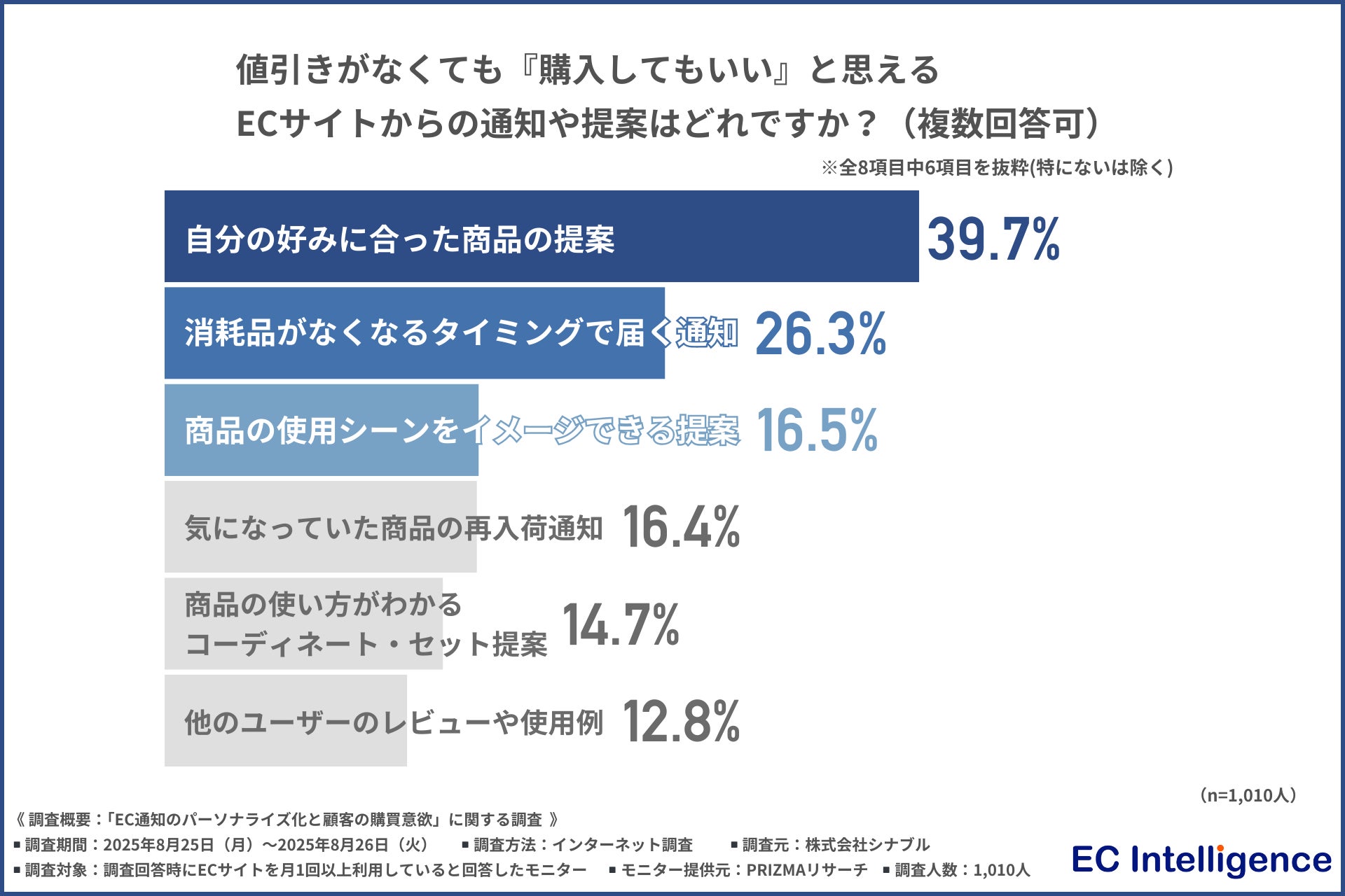 値引きがなくても購買行動を後押しする通知として、「自分好みの商品提案」「消耗品のリマインダー」などが挙げられており、ECサイトがユーザーの生活文脈を理解したうえで提案する姿勢が、信頼や利用意向の維持に直結していると考えられます。