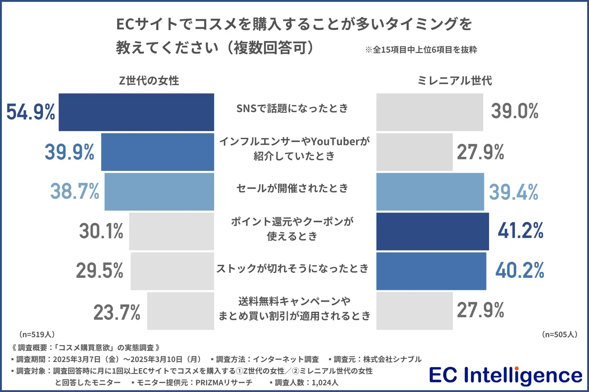 では、月に1回以上ECサイトでコスメを購入するZ世代とミレニアル世代の女性は、どのような理由で、どのようなタイミングで購入しているのでしょうか。